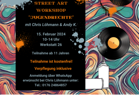 Während wir unter dem Motto „Jung, stark, kreativ“ seit November letzten Jahres wöchentlich mit Schüler:innen der Grundschule zum Thema ‚Kinder- und Jugendrechte‘ arbeiten, wird es nun zwei Ferienworkshops in der Werkstatt 26 in Königstein für Jugendliche ab 11 Jahren geben: einen Streetart-Workshop und Improvisationstheater.